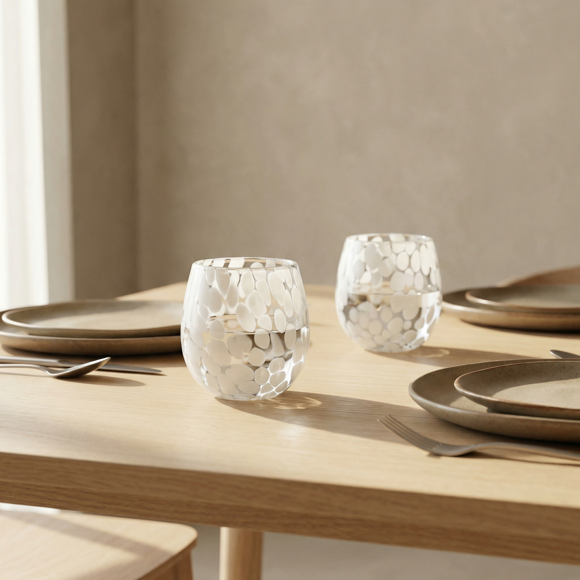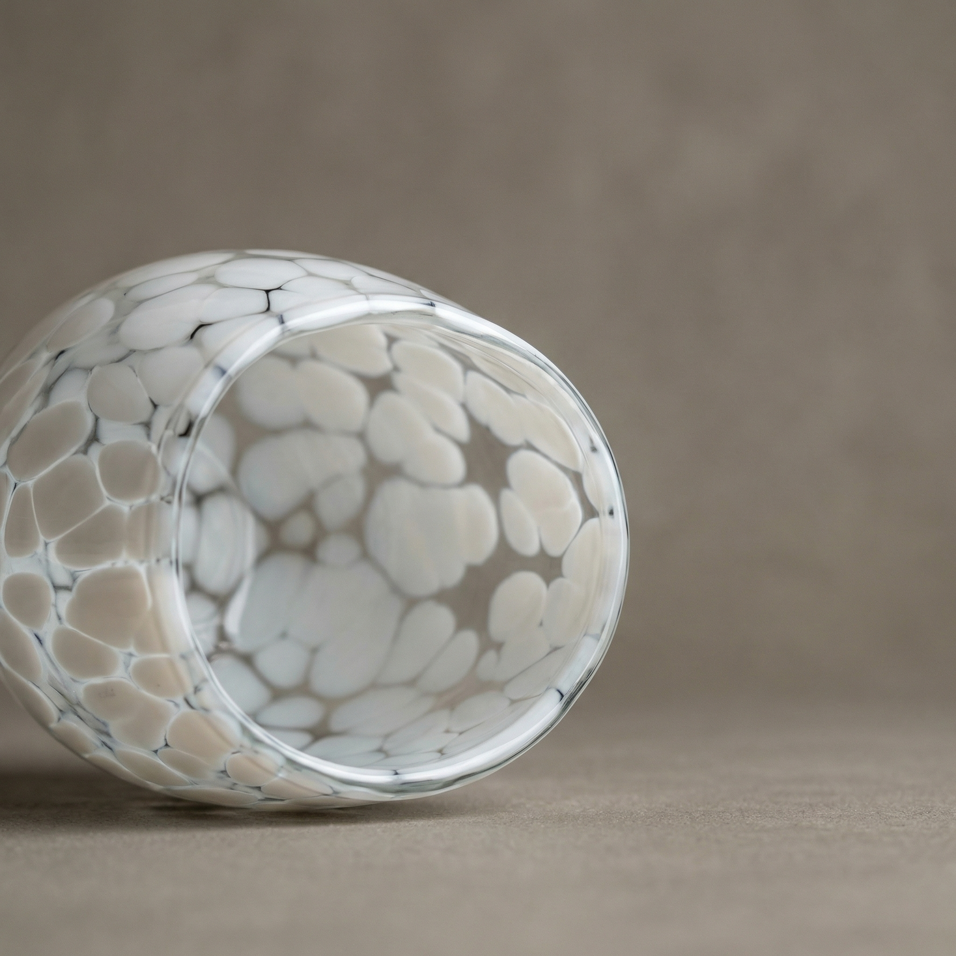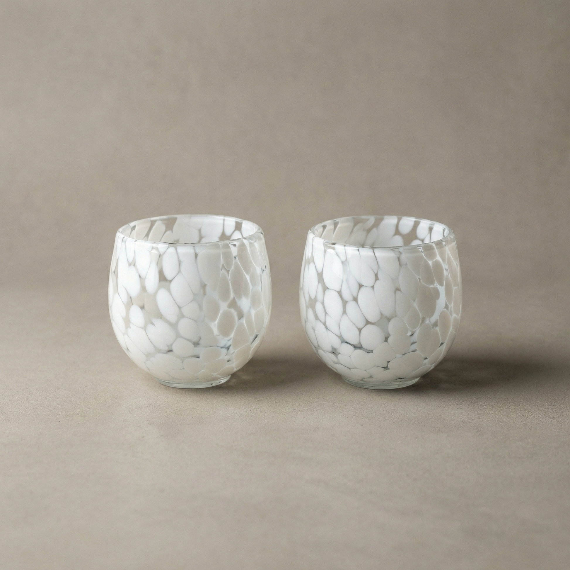 The Pebble Tumbler is a celebration of texture and minimalist form. Standing at a versatile 3 inches with a soft, rounded profile, it is designed to fit naturally in the palm of your hand. Using the traditional Cheena glass-making technique, master artisans melt dense white glass flakes directly into the molten glass, creating a permanent, frost-like mosaic that is as tactile as it is beautiful.
